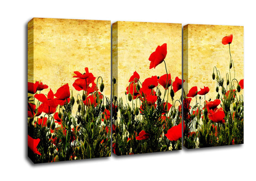 Poppy Field Golden Skys 3 Panel Canvas Print handmade in the UK. Stretched over a 2 inch thick wooden box frame, ready to hang on your wall.