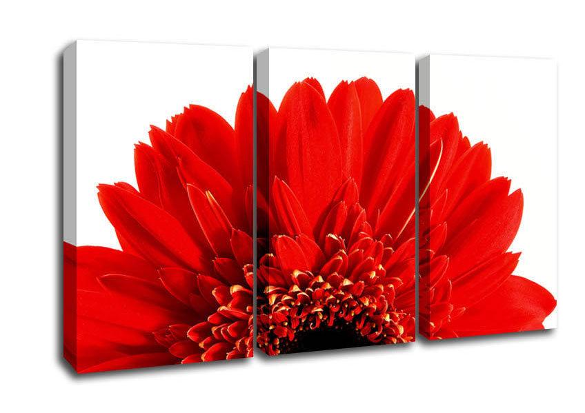 Red Gerbera Head 3 Panel Canvas Print handmade in the UK. Stretched over a 2 inch thick wooden box frame, ready to hang on your wall.
