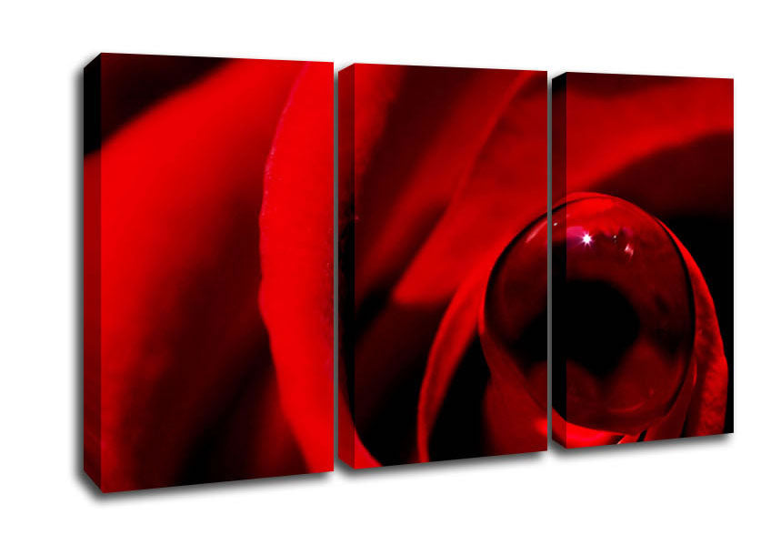 Red Rose Center Dew 3 Panel Canvas Print handmade in the UK. Stretched over a 2 inch thick wooden box frame, ready to hang on your wall.