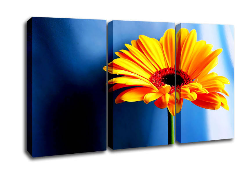Single Orange Gerbera 3 Panel Canvas Print handmade in the UK. Stretched over a 2 inch thick wooden box frame, ready to hang on your wall.