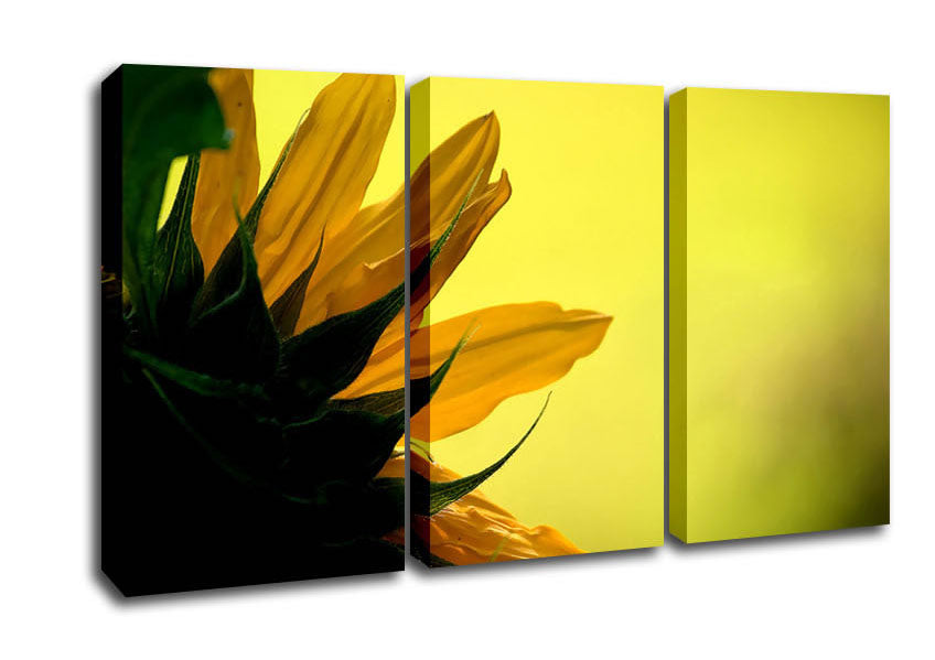 Sunflowers Macro 3 Panel Canvas Print handmade in the UK. Stretched over a 2 inch thick wooden box frame, ready to hang on your wall.