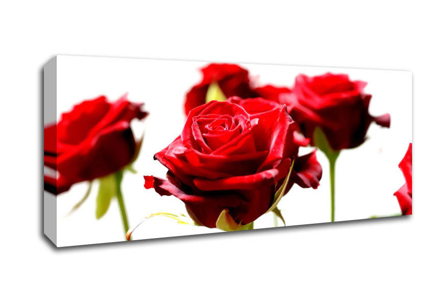 Long Stem Red Roses Panoramic Canvas Print handmade in the UK. Stretched over a 2 inch thick wooden box frame, ready to hang on your wall.
