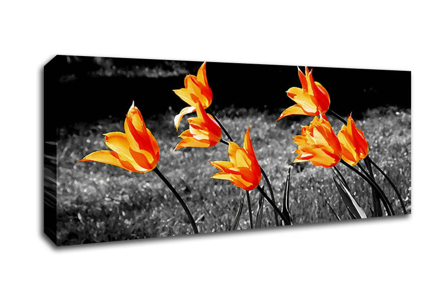 Orange Tulips On B n W Panoramic Canvas Print handmade in the UK. Stretched over a 2 inch thick wooden box frame, ready to hang on your wall.