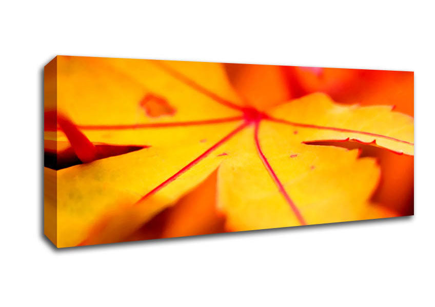 Orange Winter Leaf Panoramic Canvas Print handmade in the UK. Stretched over a 2 inch thick wooden box frame, ready to hang on your wall.