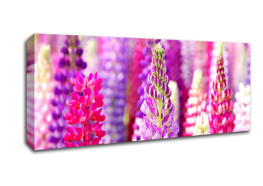 Pink And Purple Lupin Flowers Panoramic Canvas Print handmade in the UK. Stretched over a 2 inch thick wooden box frame, ready to hang on your wall.