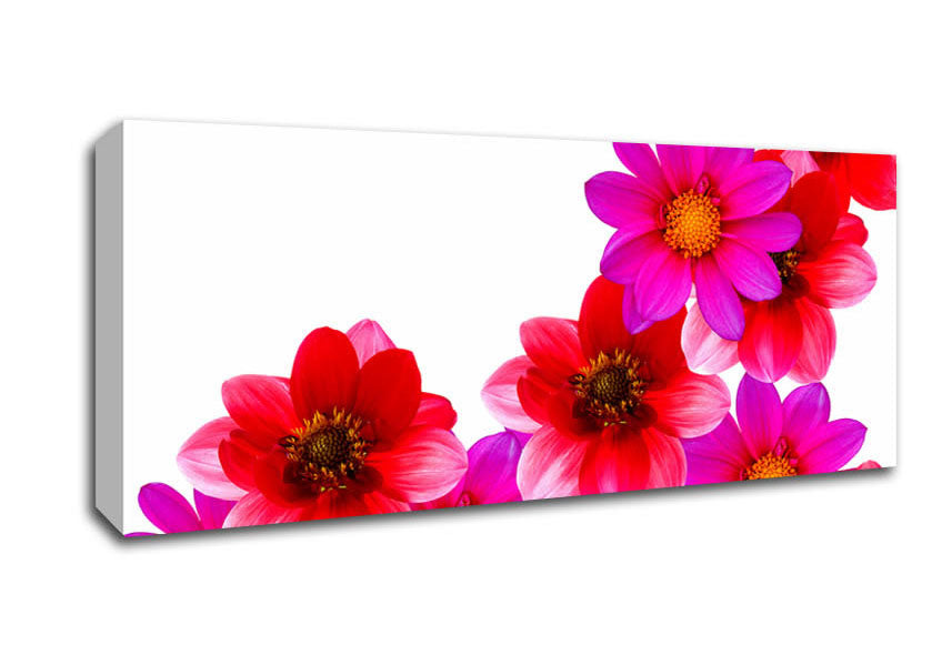 Pink And Red Flower Heads Panoramic Canvas Print handmade in the UK. Stretched over a 2 inch thick wooden box frame, ready to hang on your wall.