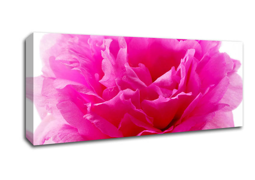 Pink Carnation Ruffles Panoramic Canvas Print handmade in the UK. Stretched over a 2 inch thick wooden box frame, ready to hang on your wall.