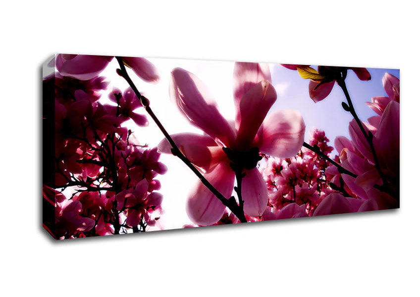 Pink Cherry Blossom In Sunlight Panoramic Canvas Print handmade in the UK. Stretched over a 2 inch thick wooden box frame, ready to hang on your wall.