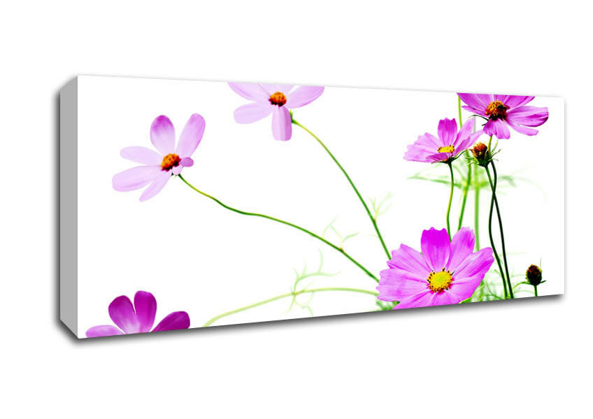 Pink Daisy Bloom Panoramic Canvas Print handmade in the UK. Stretched over a 2 inch thick wooden box frame, ready to hang on your wall.