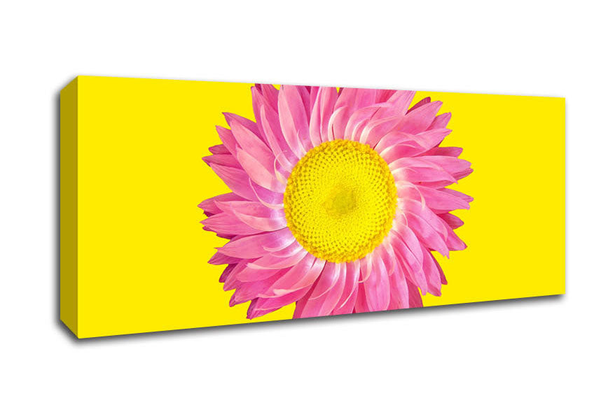 Pink Daisy On Yellow Twist Panoramic Canvas Print handmade in the UK. Stretched over a 2 inch thick wooden box frame, ready to hang on your wall.