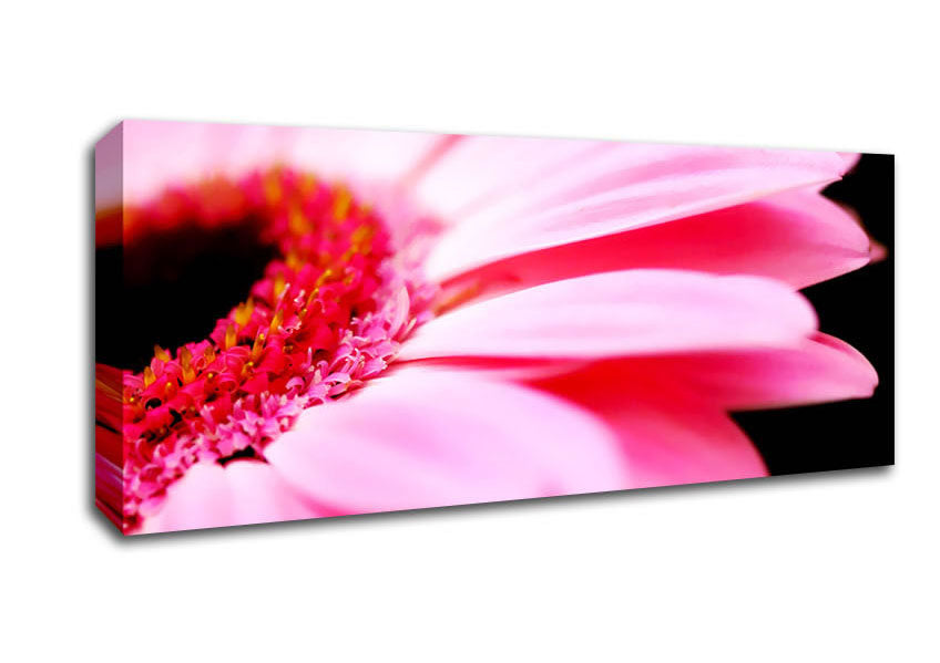 Pink Gerbera Close-Up Panoramic Canvas Print handmade in the UK. Stretched over a 2 inch thick wooden box frame, ready to hang on your wall.