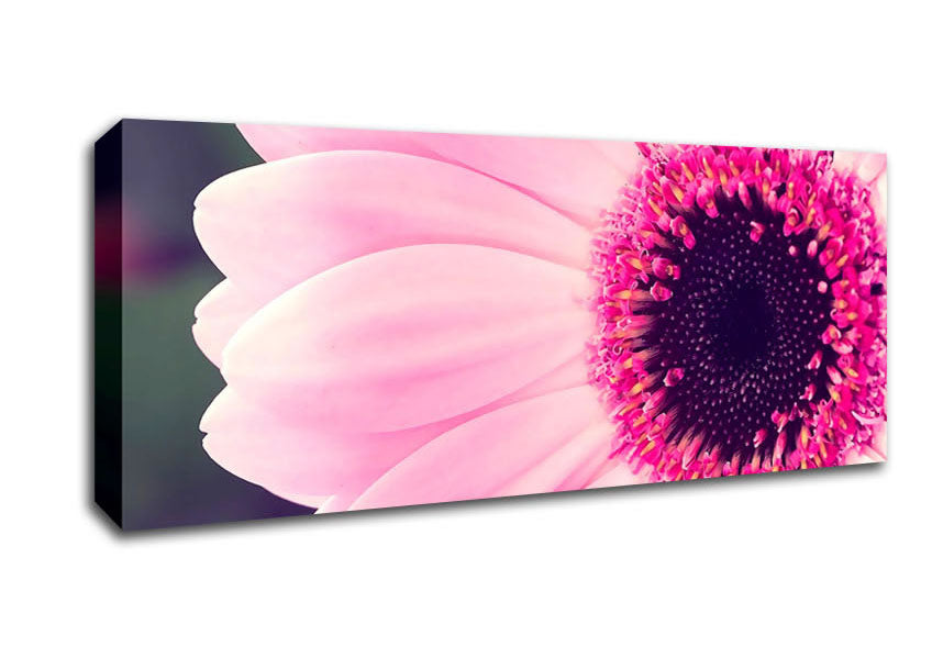 Pink Gerbera Daisy Centre Panoramic Canvas Print handmade in the UK. Stretched over a 2 inch thick wooden box frame, ready to hang on your wall.
