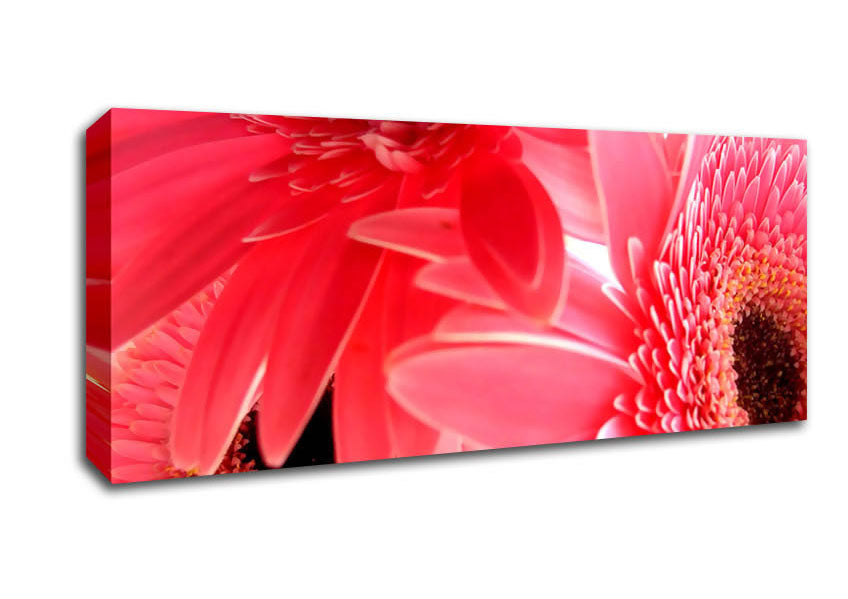 Pink Gerbera Flower Mayhem Panoramic Canvas Print handmade in the UK. Stretched over a 2 inch thick wooden box frame, ready to hang on your wall.