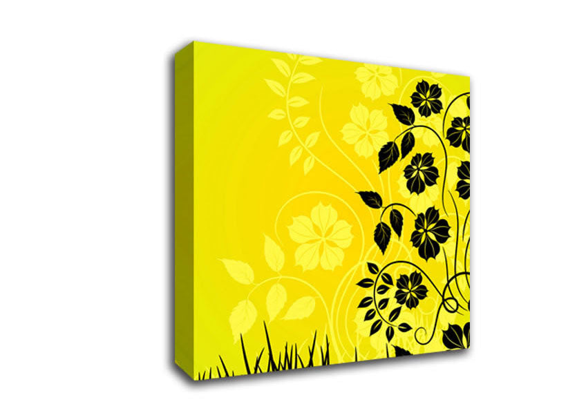 Black Flowers In Yellow Sun Square Canvas Print handmade in the UK. Stretched over a 2 inch thick wooden box frame, ready to hang on your wall.