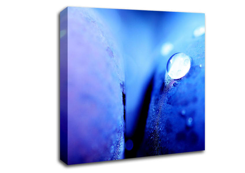 Blue Petal Water Droplet Square Canvas Print handmade in the UK. Stretched over a 2 inch thick wooden box frame, ready to hang on your wall.