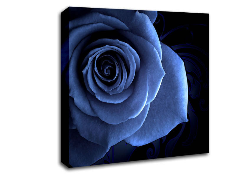 Blue Rose On Black Square Canvas Print handmade in the UK. Stretched over a 2 inch thick wooden box frame, ready to hang on your wall.