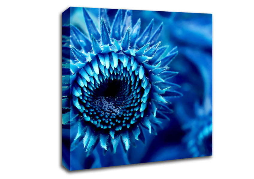 Blue Sunflower Square Canvas Print handmade in the UK. Stretched over a 2 inch thick wooden box frame, ready to hang on your wall.