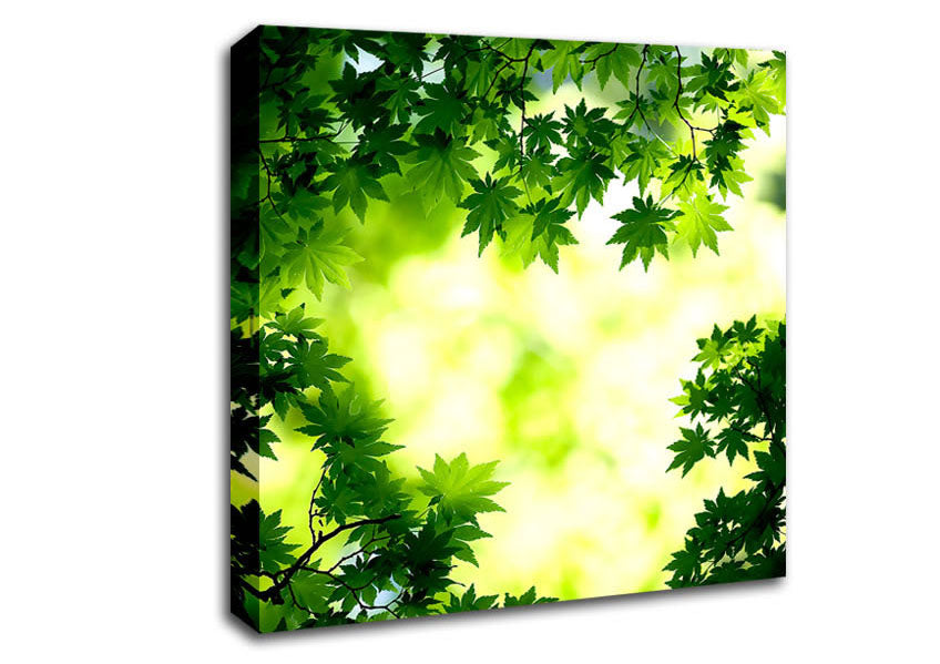 Green Maple Leaves Square Canvas Print handmade in the UK. Stretched over a 2 inch thick wooden box frame, ready to hang on your wall.