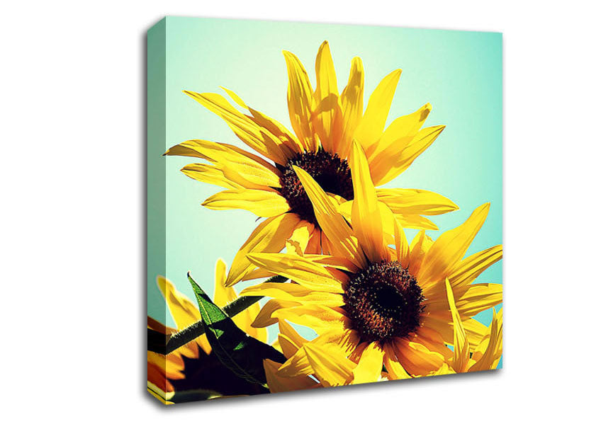 Sunflowers Against Blue Sky Square Canvas Print handmade in the UK. Stretched over a 2 inch thick wooden box frame, ready to hang on your wall.