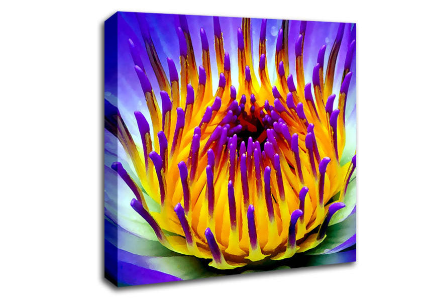 Vibrant Purple Water Lily Square Canvas Print handmade in the UK. Stretched over a 2 inch thick wooden box frame, ready to hang on your wall.