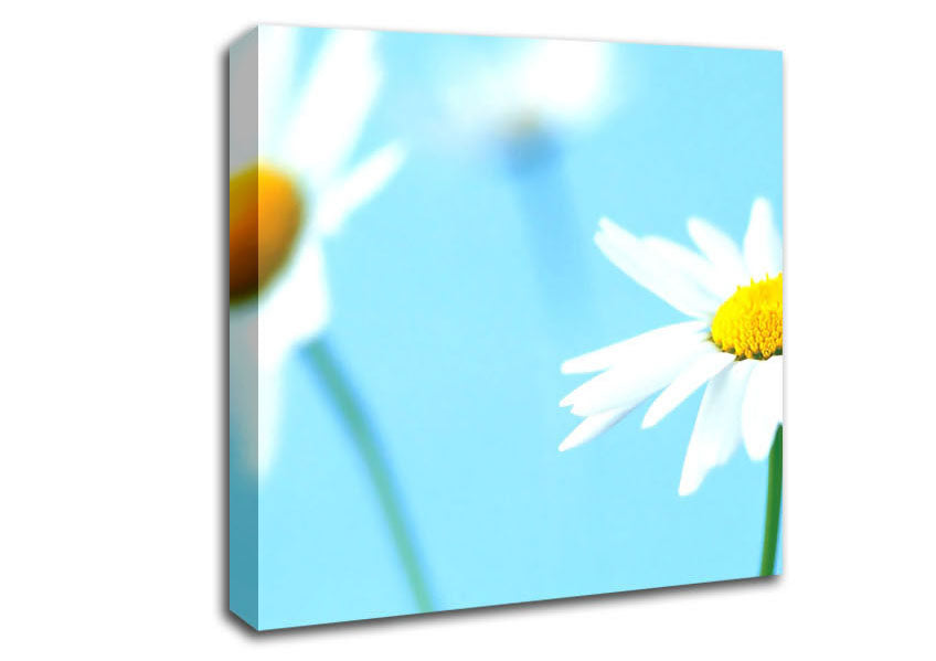 White Daisies On Blue Square Canvas Print handmade in the UK. Stretched over a 2 inch thick wooden box frame, ready to hang on your wall.