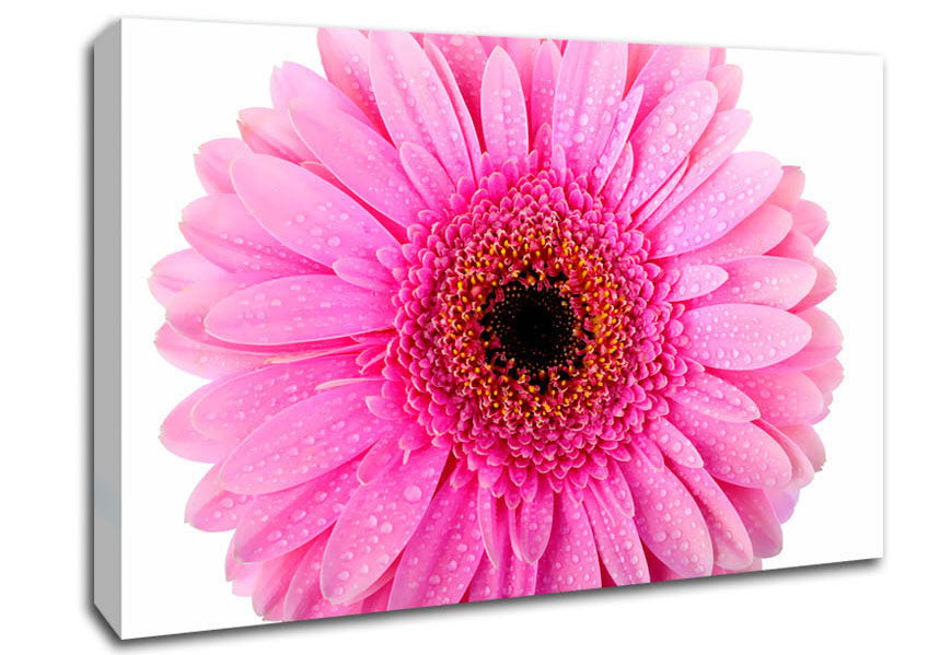 Baby Pink Dew Drop Gerbera Canvas Print handmade in the UK. Stretched over a 2 inch thick wooden box frame, ready to hang on your wall.