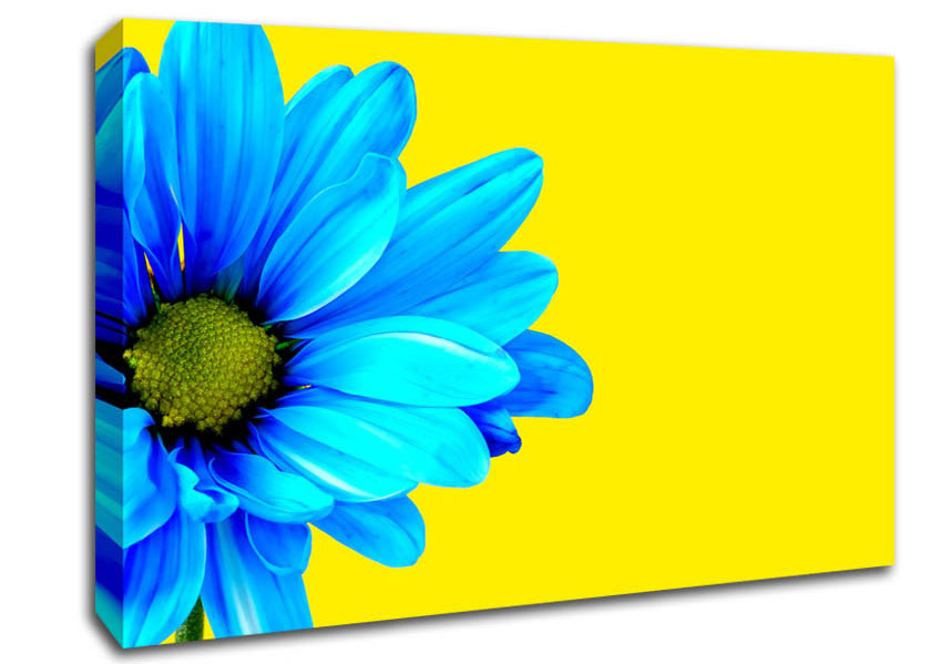 Blue Daisy On Yellow Canvas Print handmade in the UK. Stretched over a 2 inch thick wooden box frame, ready to hang on your wall.