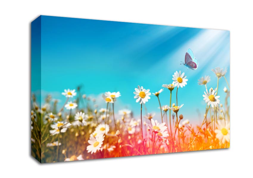 Butterfly landing on a daisy Canvas Print handmade in the UK. Stretched over a 2 inch thick wooden box frame, ready to hang on your wall.
