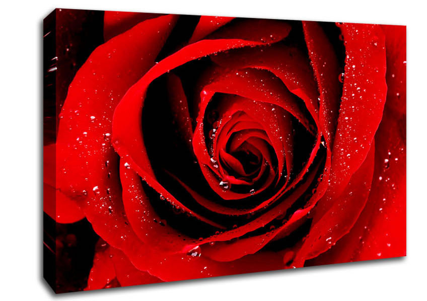 Close-Up Of A Red Rose Dew Drop Canvas Print handmade in the UK. Stretched over a 2 inch thick wooden box frame, ready to hang on your wall.