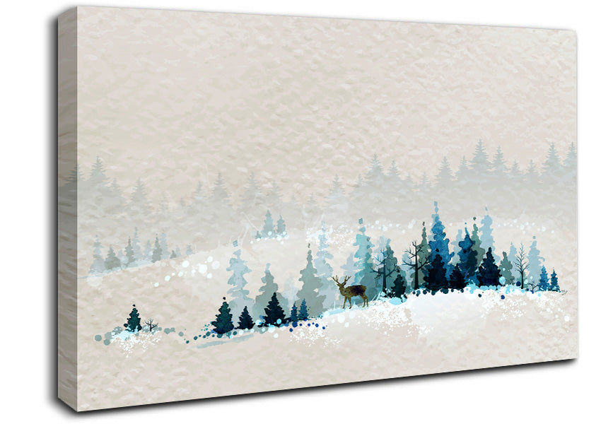 Deer In Winter Wonderland Canvas Print handmade in the UK. Stretched over a 2 inch thick wooden box frame, ready to hang on your wall.