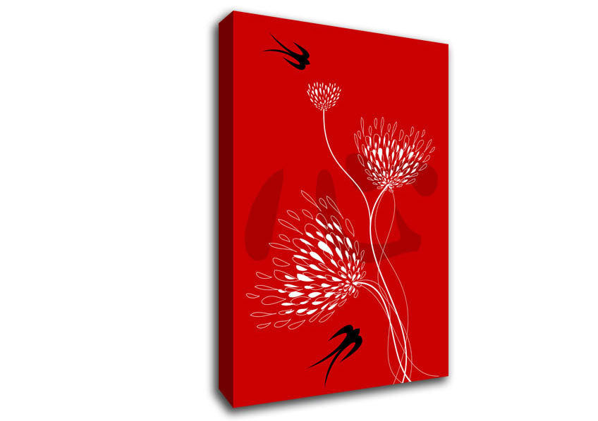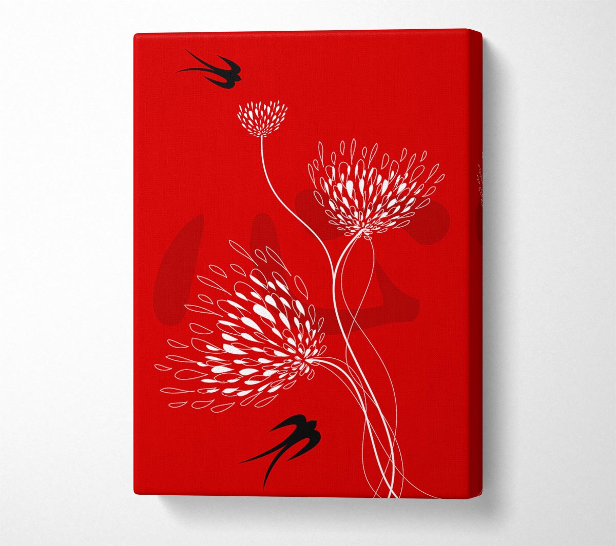 Flower Doves White On Red Canvas Print handmade in the UK. Stretched over a 2 inch thick wooden box frame, ready to hang on your wall.