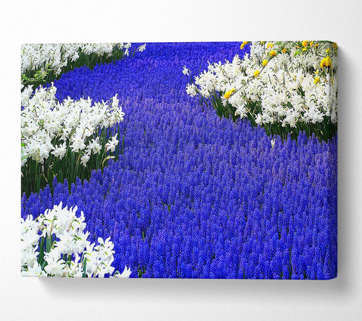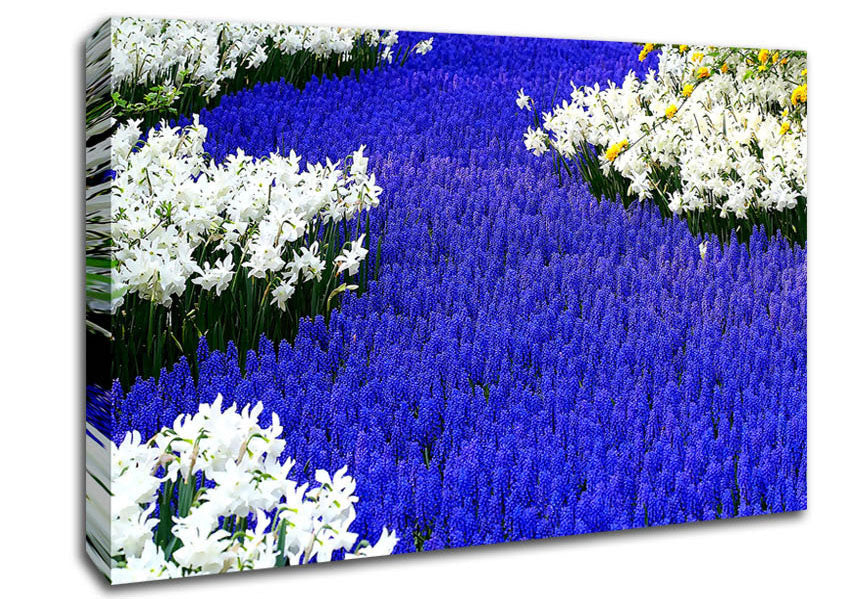 Grape Hyacinths And Daffodils Canvas Print handmade in the UK. Stretched over a 2 inch thick wooden box frame, ready to hang on your wall.