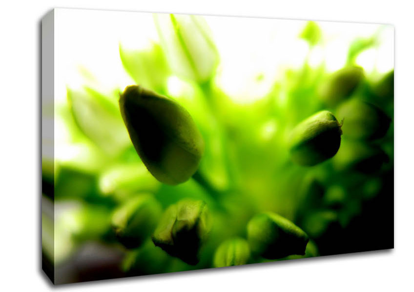 Green Buds In Sunlight Canvas Print handmade in the UK. Stretched over a 2 inch thick wooden box frame, ready to hang on your wall.