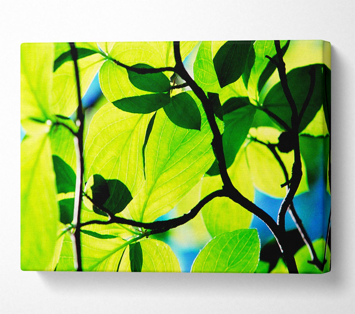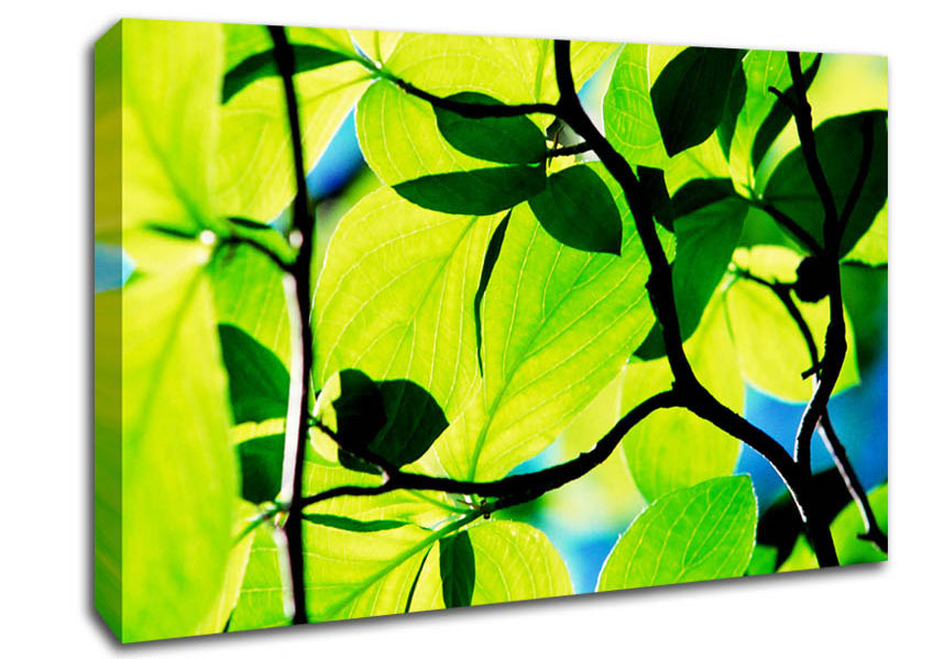 Green Leaves In Sunlight Canvas Print handmade in the UK. Stretched over a 2 inch thick wooden box frame, ready to hang on your wall.