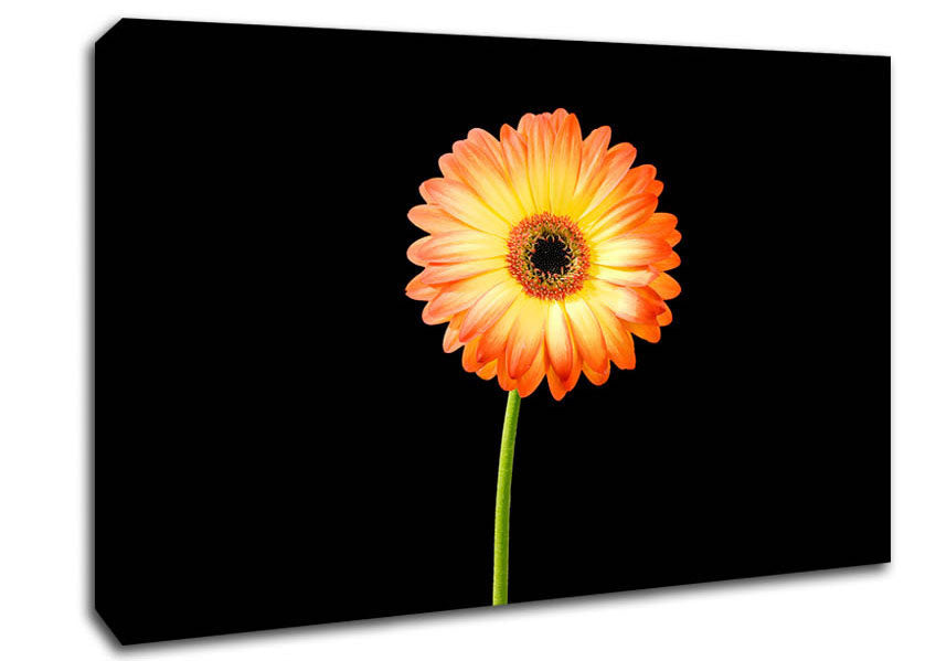 Orange Gerbera On Black Canvas Print handmade in the UK. Stretched over a 2 inch thick wooden box frame, ready to hang on your wall.
