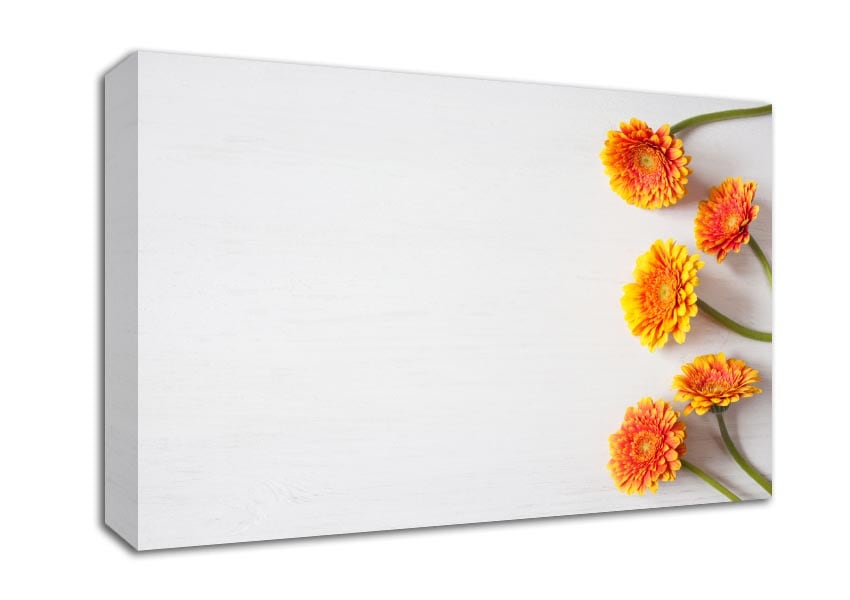 Orange Gerberas laid out Canvas Print handmade in the UK. Stretched over a 2 inch thick wooden box frame, ready to hang on your wall.