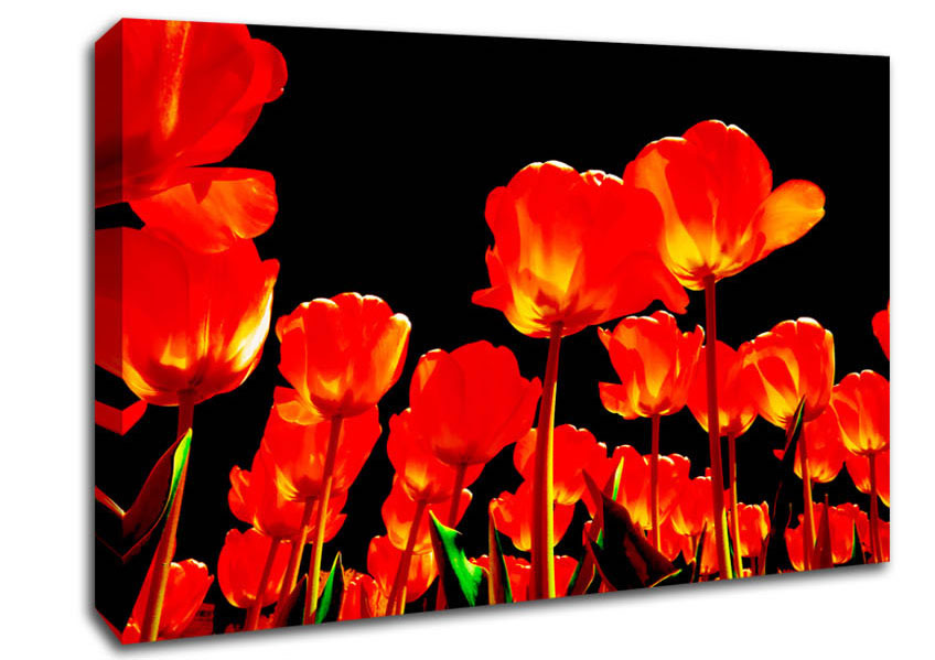 Orange Tulips Black Skies Canvas Print handmade in the UK. Stretched over a 2 inch thick wooden box frame, ready to hang on your wall.