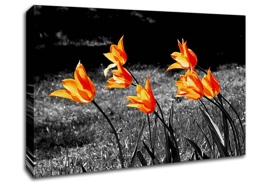 Orange Tulips On B n W Canvas Print handmade in the UK. Stretched over a 2 inch thick wooden box frame, ready to hang on your wall.