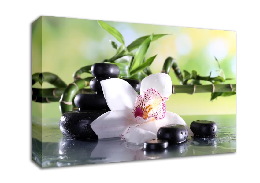 Orchids on the stones bamboo Canvas Print handmade in the UK. Stretched over a 2 inch thick wooden box frame, ready to hang on your wall.