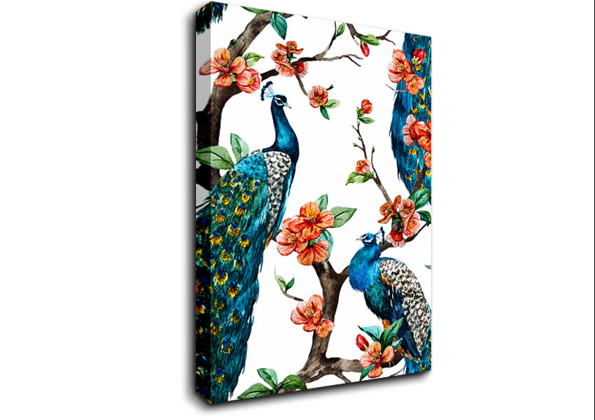 Peacock Branches Canvas Print handmade in the UK. Stretched over a 2 inch thick wooden box frame, ready to hang on your wall.