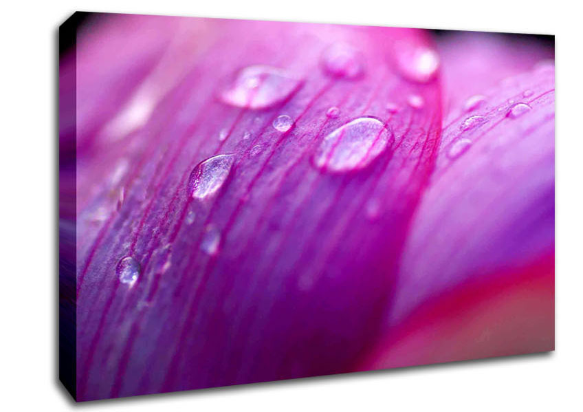 Pink Petal Dewdrop Beauty Canvas Print handmade in the UK. Stretched over a 2 inch thick wooden box frame, ready to hang on your wall.