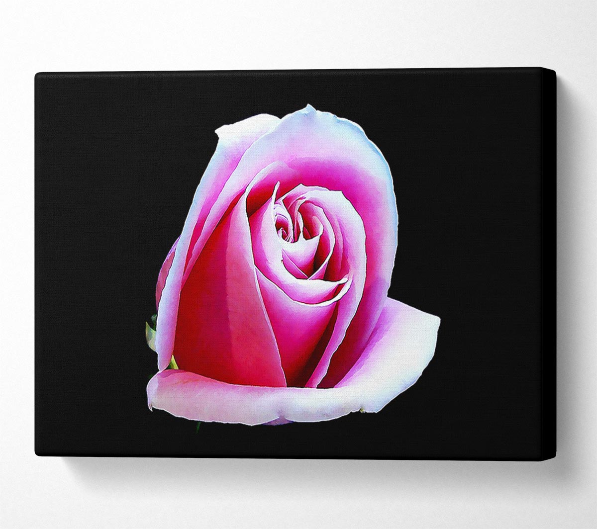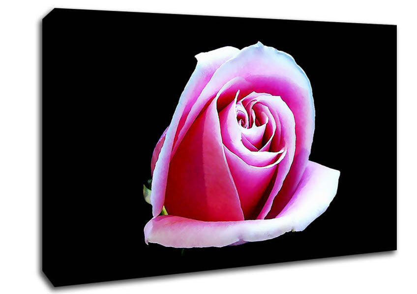 Pink Rose On Black Canvas Print handmade in the UK. Stretched over a 2 inch thick wooden box frame, ready to hang on your wall.