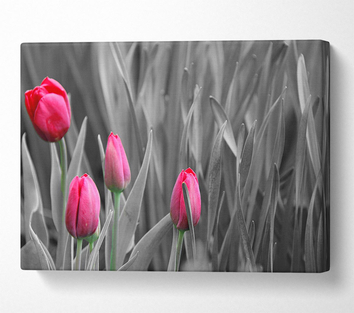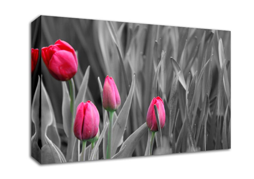 Pink tulips black and white Canvas Print handmade in the UK. Stretched over a 2 inch thick wooden box frame, ready to hang on your wall.