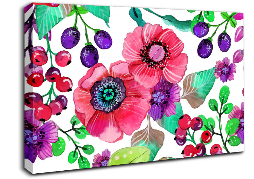 Poppies And Berries Canvas Print handmade in the UK. Stretched over a 2 inch thick wooden box frame, ready to hang on your wall.