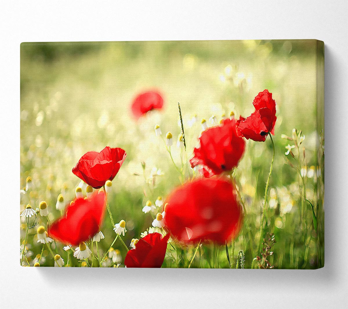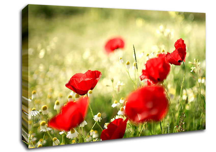 Poppies And Chamomile Canvas Print handmade in the UK. Stretched over a 2 inch thick wooden box frame, ready to hang on your wall.