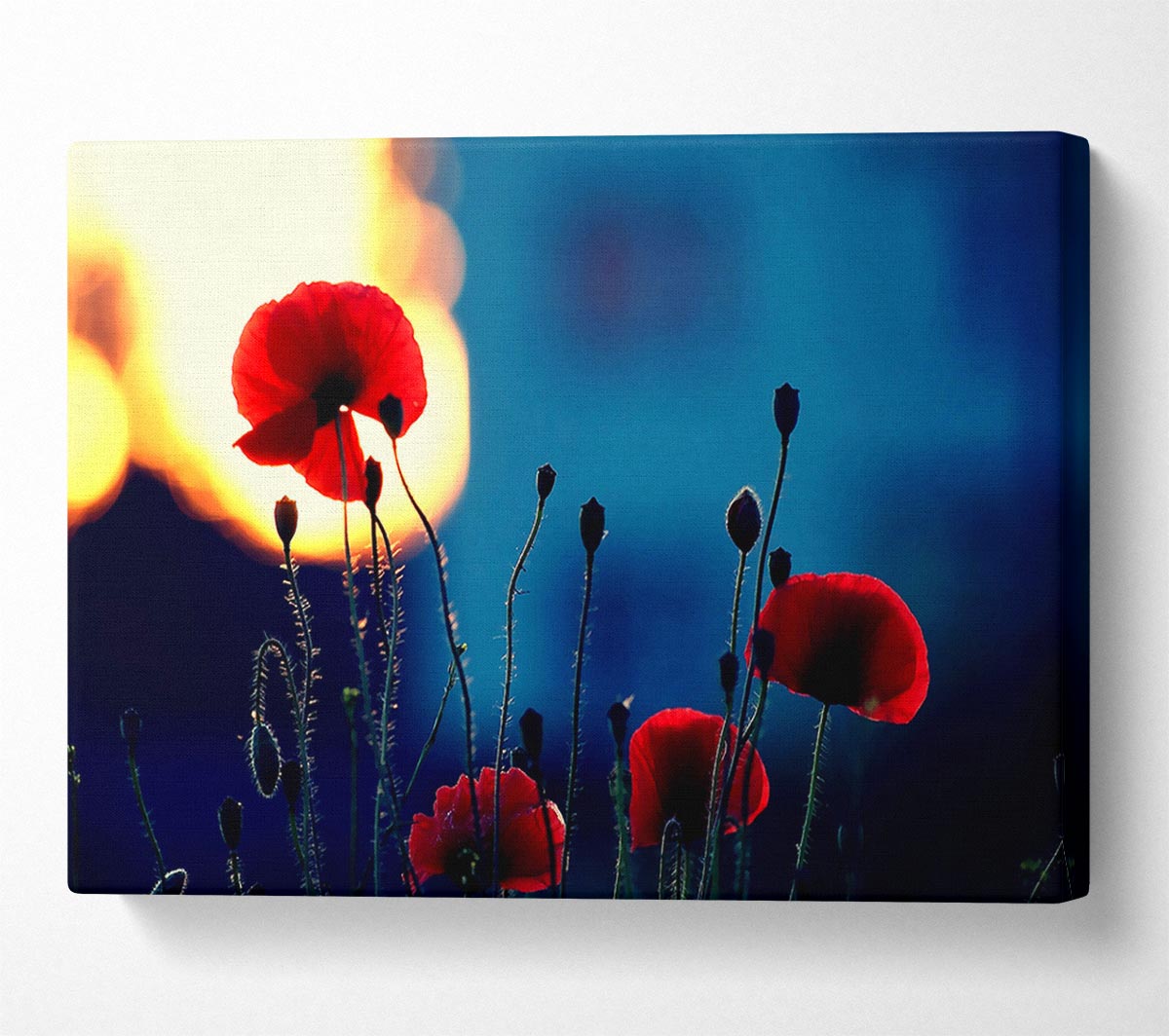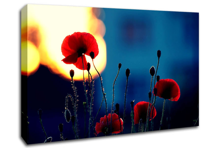 Poppies In The Sunset Canvas Print handmade in the UK. Stretched over a 2 inch thick wooden box frame, ready to hang on your wall.