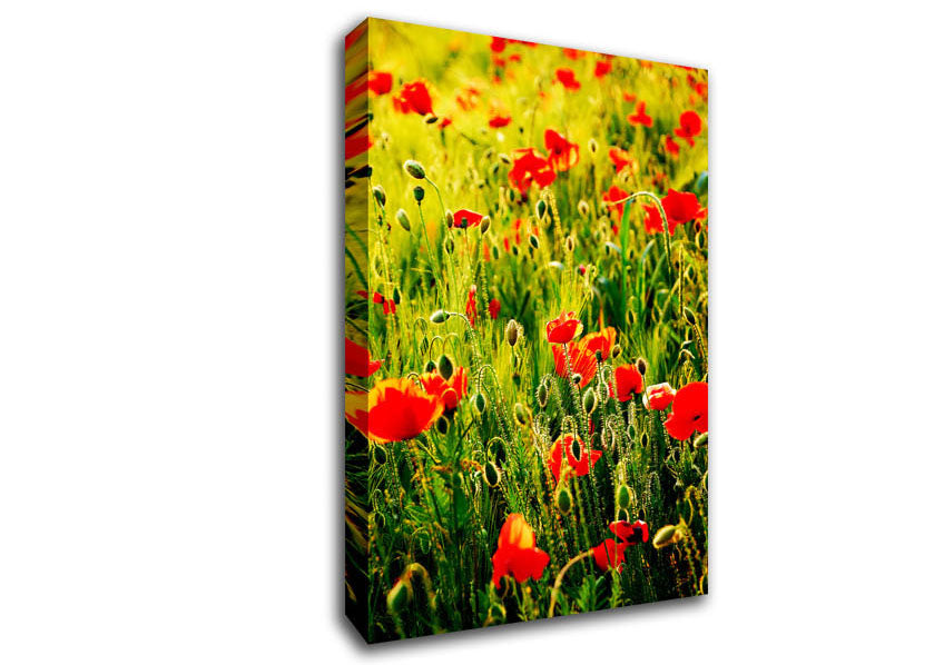 Poppy Field Sunlight Canvas Print handmade in the UK. Stretched over a 2 inch thick wooden box frame, ready to hang on your wall.