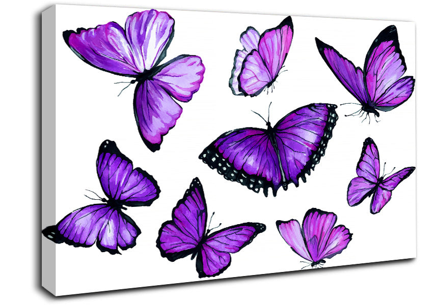 Purple Butterfly Frenzy Canvas Print handmade in the UK. Stretched over a 2 inch thick wooden box frame, ready to hang on your wall.