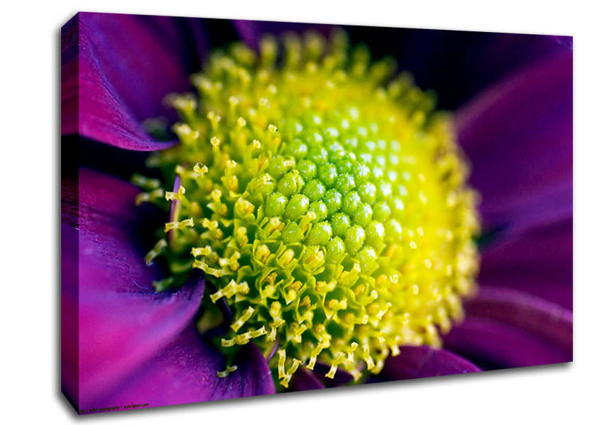Purple Centre Of A Daisy Canvas Print handmade in the UK. Stretched over a 2 inch thick wooden box frame, ready to hang on your wall.