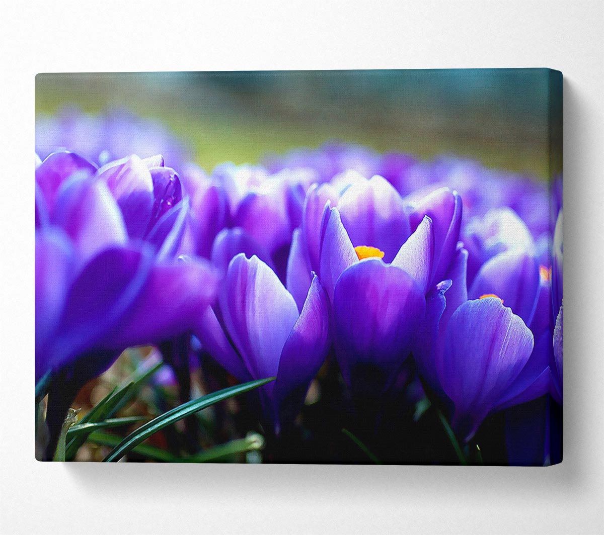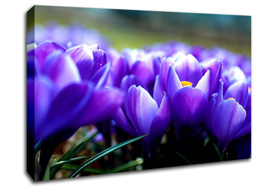Purple Crocus Garden Canvas Print handmade in the UK. Stretched over a 2 inch thick wooden box frame, ready to hang on your wall.